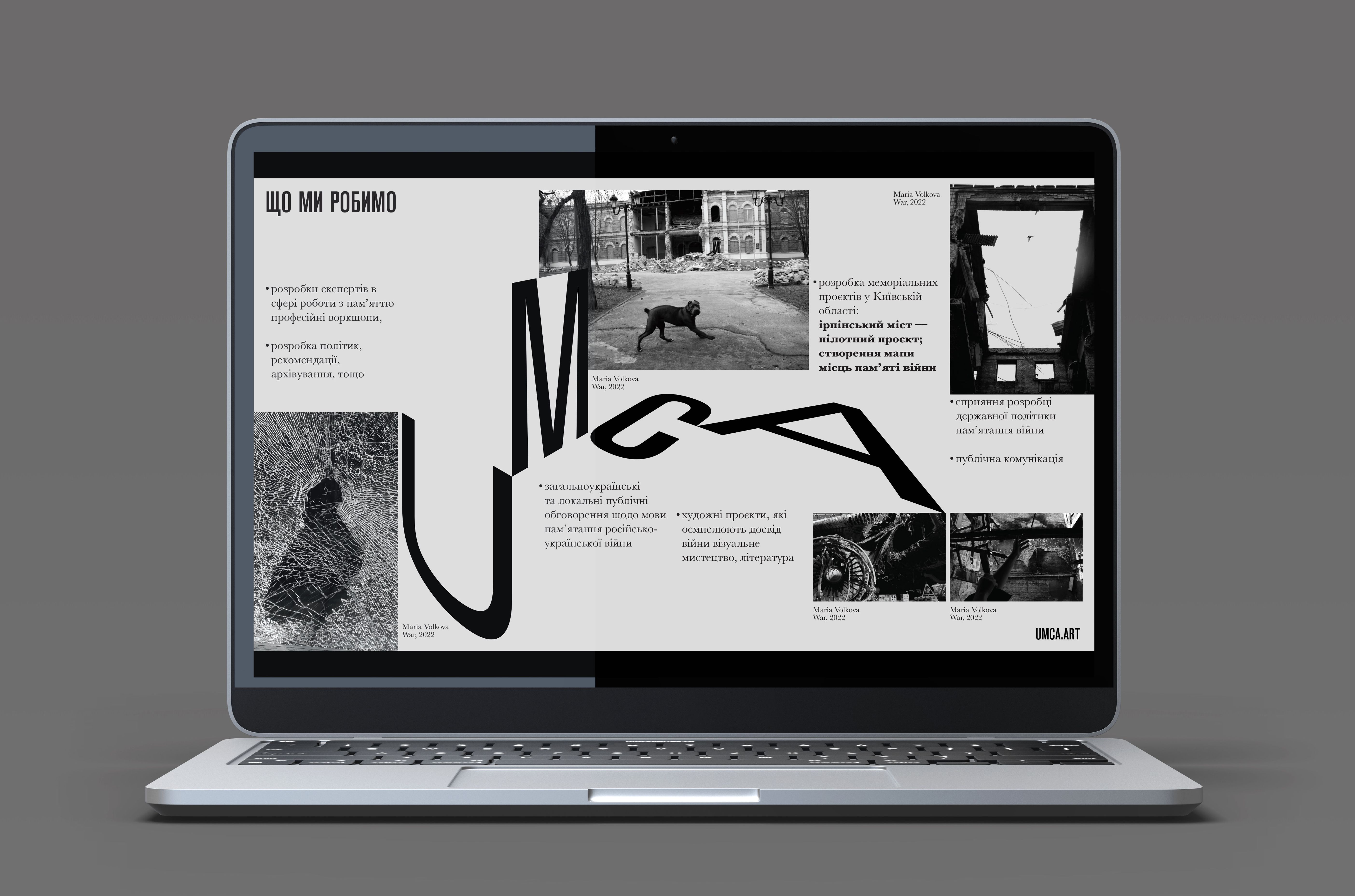 It is an institution of a new type that brings together professionals of contemporary art in Ukraine, makes it more accessible to different audiences and enables the emergence of a public dialogue about a common future within its territory. UMCA employs the idea of decentralisation, being a network of autonomous institutions in different regions united by a common mission. So the museum's brand identity is built around the idea of horizontal connections — all four letters stay in the same dimension, but maintain their own different positions, and that reflects the autonomy and equality of member institutions.
